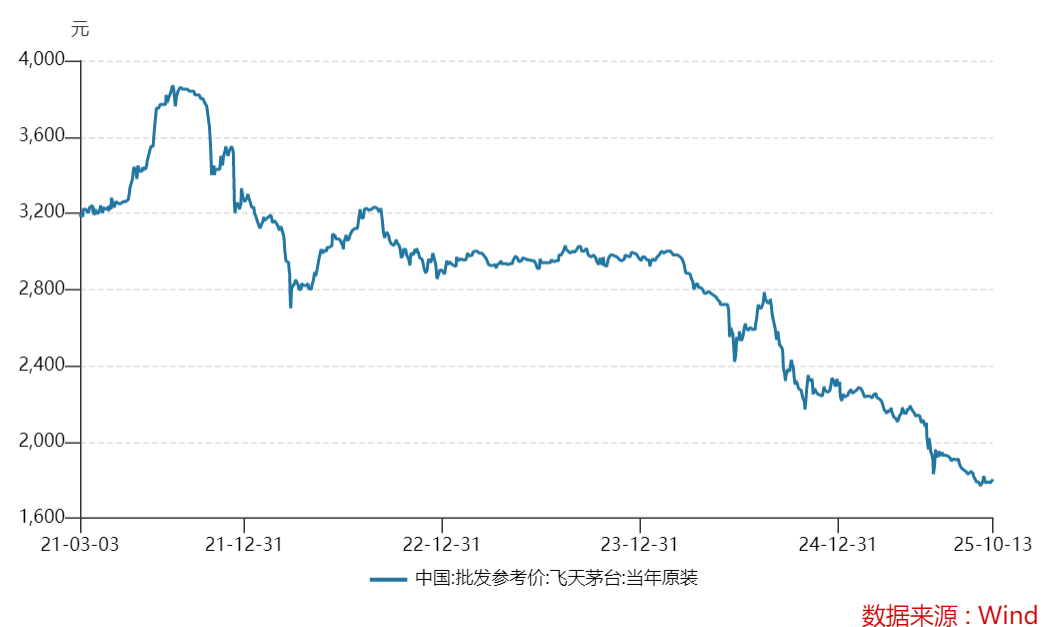 回顾价格走势,Wind数据显示:2021年散飞价格维持在3000元上方,2022-2023年稳定在2500元区间,2024年回落至2100元附近。进入2025年后,价格加速下行,当前1765元的价位已创近五年新低。市场分析人士指出,这种量价齐跌的现象在茅台发展史上极为罕见。