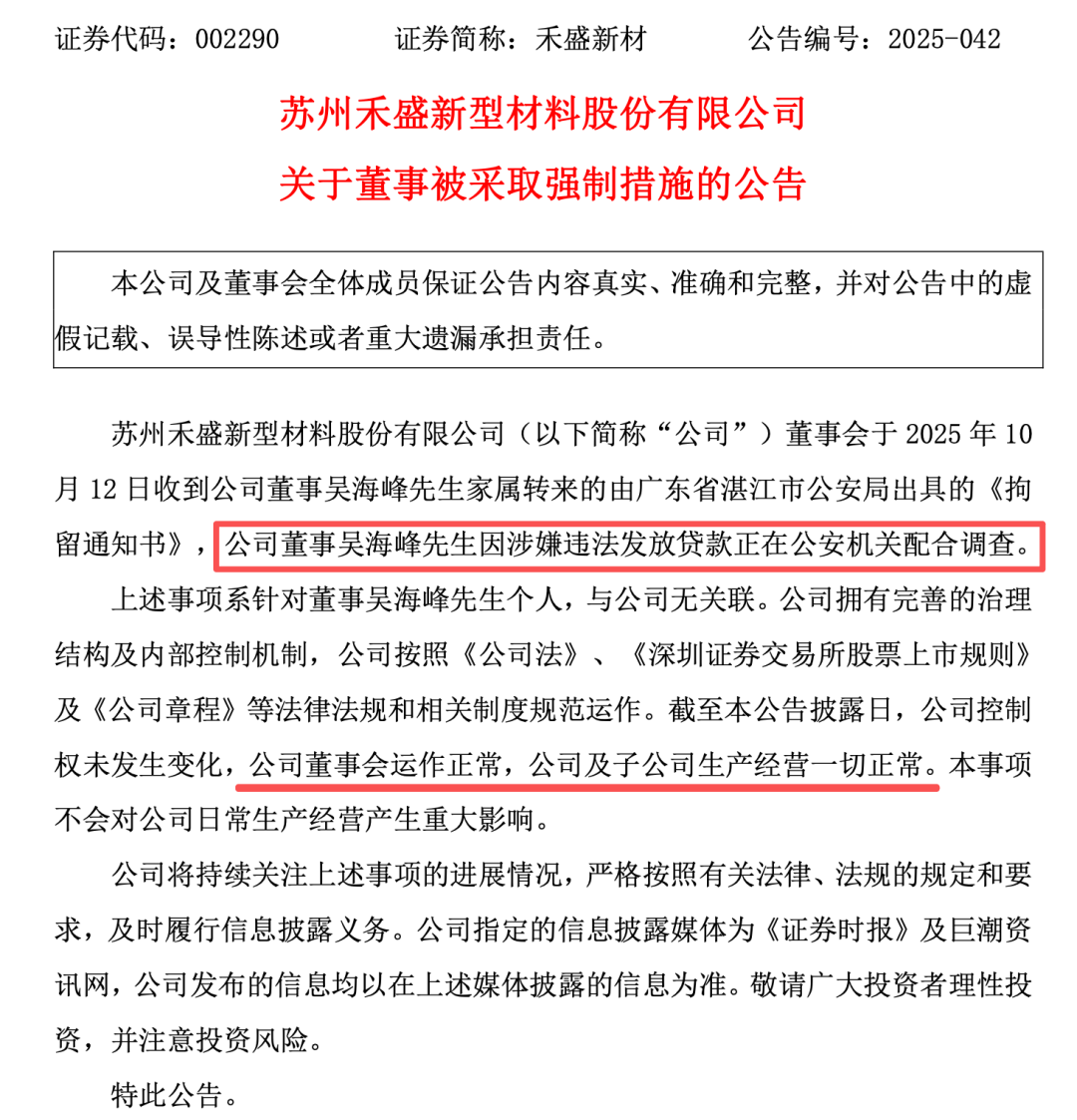 10月13日晚间,禾盛新材(股票代码:002290)发布公告称,公司董事吴海峰因涉嫌违法发放贷款,目前正在公安机关配合调查。此消息引发市场关注。
