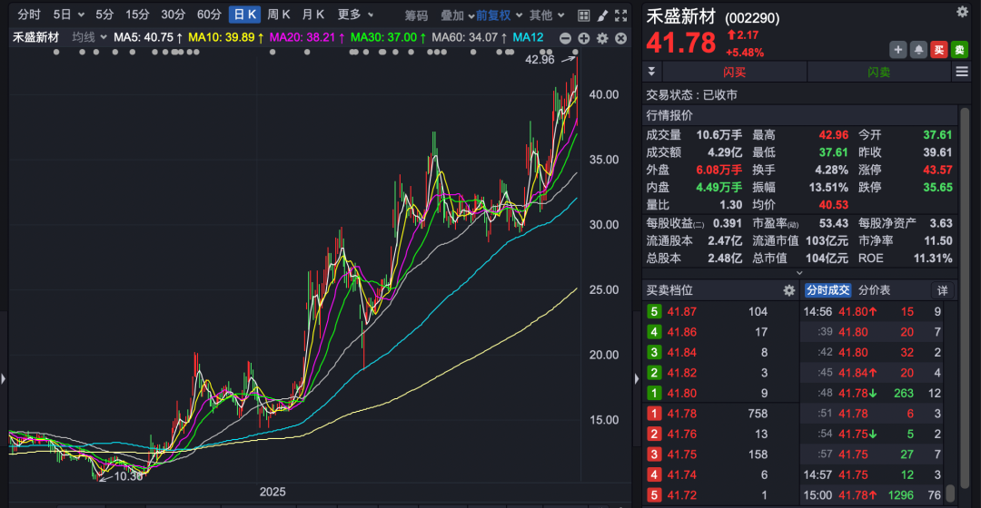 禾盛新材的主营业务为家电用外观复合材料(PCM/VCM/PPM)的研发、生产及销售。截至2025年6月30日,公司拥有四条PCM/VCM生产线、一条智能化复合材料生产线及一条3D打印生产线。公司产品已覆盖国内外众多知名家电品牌,市场占有率较高。