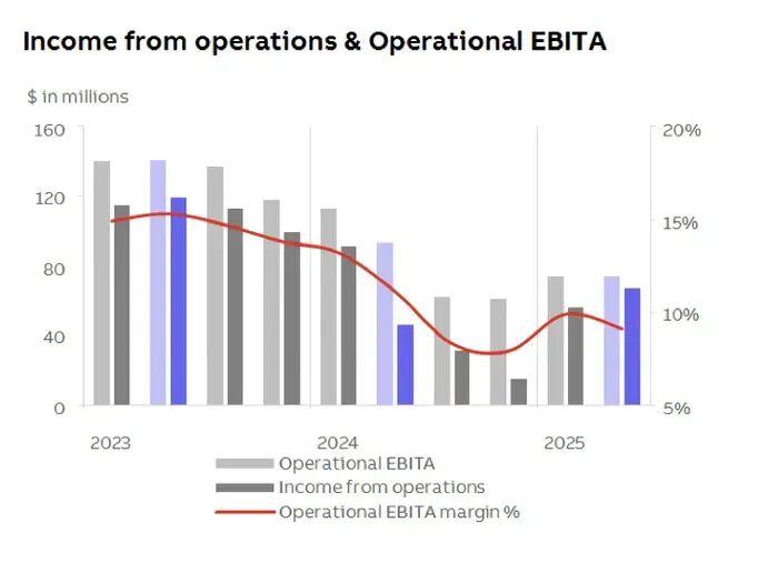 2025年第二财年,ABB机器人与离散自动化事业部营收同比下滑,运营息税摊销前利润下降20%至7400万美元,利润率从11.1%降至 9.1%。