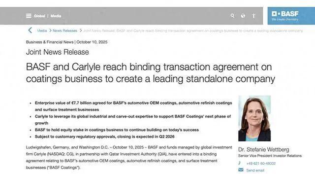 几乎在同时,德国化工巨头巴斯夫宣布以77亿欧元估值剥离涂料业务,与凯雷集团及卡塔尔投资局成立合资公司。