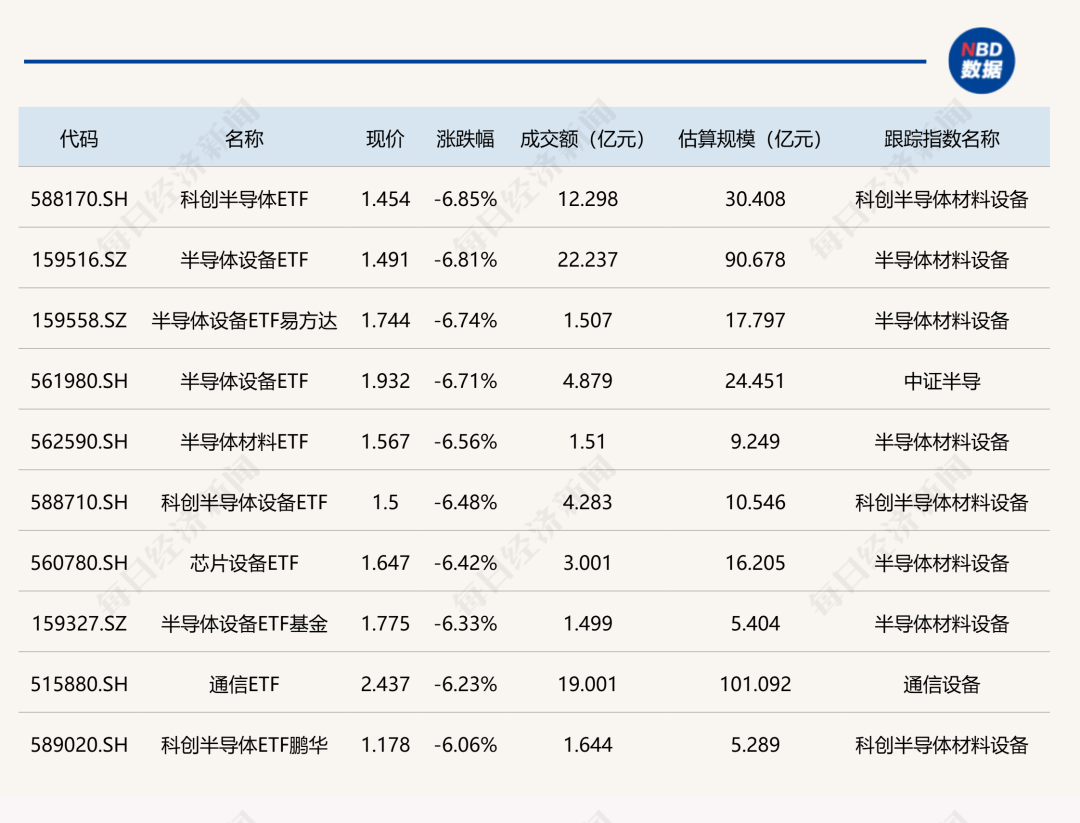 然而,并非所有板块都表现强劲。下跌方面,半导体相关ETF跌幅超过6%,成为市场中的一大焦点。半导体板块的调整可能受到多种因素的影响,包括行业周期、技术更新换代以及市场需求变化等。