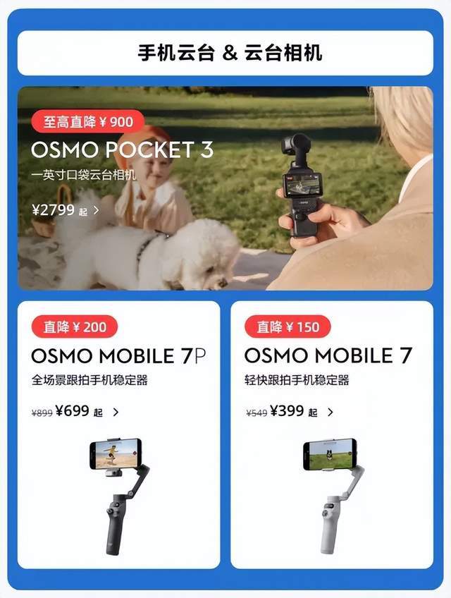 此次降价涉及多款产品,其中上市仅一年的Osmo Pocket 3云台相机标准版直降700元,全能套装版直降900元。户外电源Power 1000 V2降价900元,运动相机Action 4最高降价1129元。如此大幅度的降价,在消费电子市场并不常见。