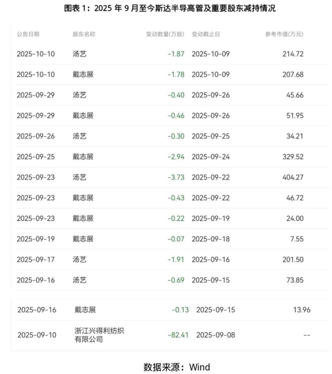 2025年半年报披露后,斯达半导副总经理汤艺和戴志展于9-10月初密集减持,累计套现约1655万元。与此同时,第二大股东浙江兴得利纺织有限公司在8-9月减持82.41万股,按区间均价101.61元/股计算,套现超8000万元。高管与股东的减持行为,叠加业绩波动,引发市场对公司未来发展的担忧。