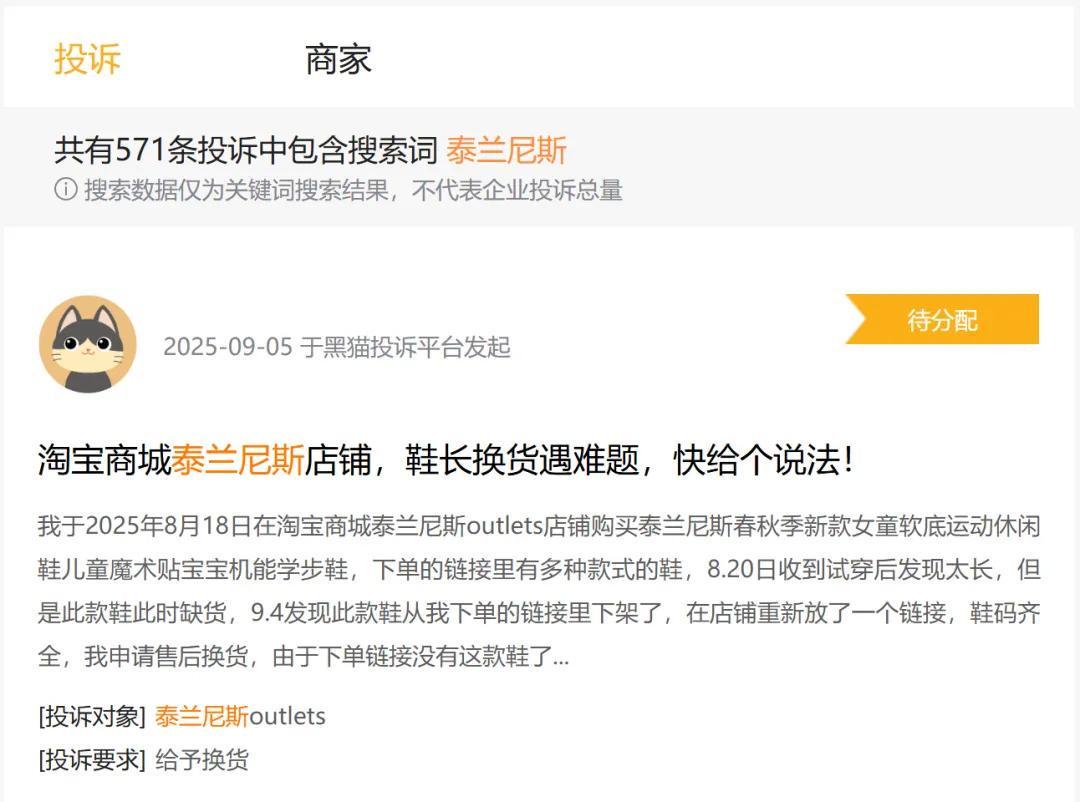 社交平台上,越来越多宝妈晒出“避雷帖”。有人说孩子穿它的鞋在瓷砖上打滑,摔得膝盖青了;有人发现鞋穿了一个月就开胶;还有人吐槽“鞋里有臭味,洗了也散不掉”。黑猫投诉平台上,关于泰兰尼斯的投诉已超500条。
