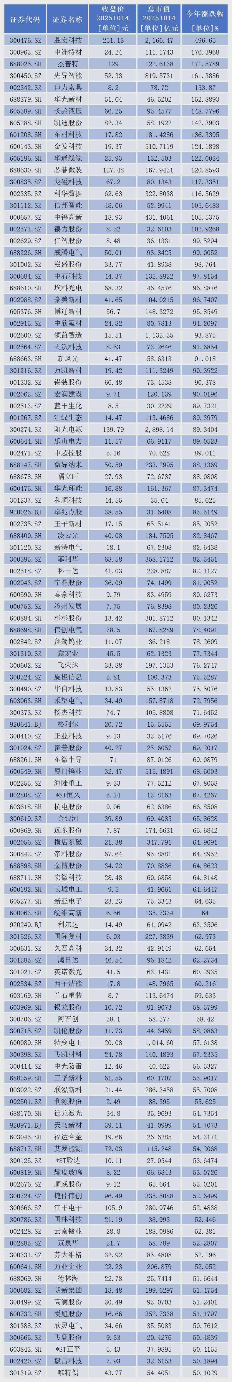 从二级市场表现看,今年以来,429家上市公司股价出现上涨,其中,胜宏科技(300476.SZ)、中洲特材(300963.SZ)、杰普特(688025.SH)、先导智能(300450.SZ)、巨力索具(002342.SZ)、华光新材(688379.SH)、长龄液压(605389.SH)、凯迪股份(605288.SH)、东材科技(601208.SH)、金发科技(600143.SH)、华通线缆(605196.SH)、芯碁微装(688630.SH)、龙磁科技(300835.SZ)、科华数据(002335.SZ)、信邦智能(301112.SZ)、中钨高新(000657.SZ)、德力股份(002571.SZ)17家上市公司股价成功实现翻倍。