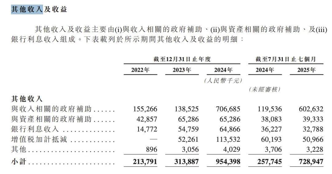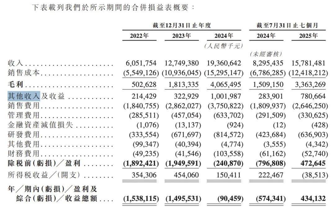 直观来看,虽然收入上涨带动了毛利提升,但相应的岚图今年的三费支出也水涨船高。能够实现盈利的关键在于“其他收入及收益”的暴增。去年前7个月,岚图的其他收入及收益不到2.84亿元,今年同期这一数字暴涨至7.8亿元,是去年同期的275%。