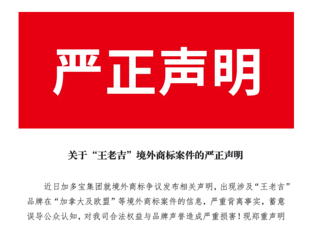 尽管加多宝的推文未指名道姓,但当晚王老吉便发布《严正声明》予以回击,直指加多宝“就境外商标争议发布相关声明,严重背离事实,误导公众认知,对我司合法权益与品牌声誉造成严重损害”。