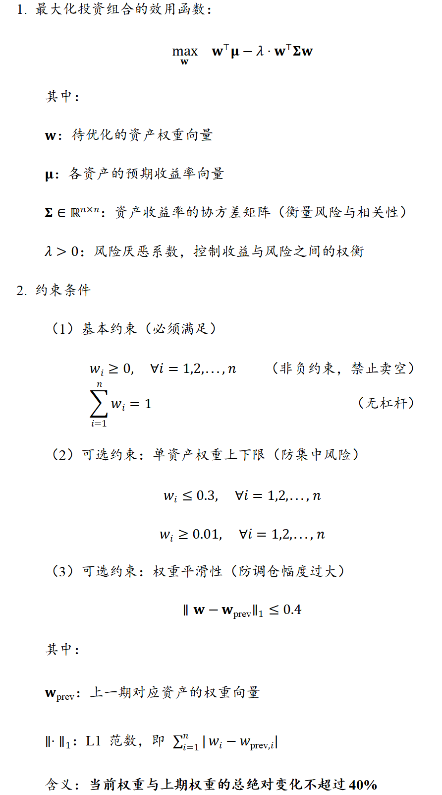 平滑性约束:通过引入战略基准权重,约束新权重与旧权重之间的L1范数变化不超过40%,从而有效控制换手率与交易成本。