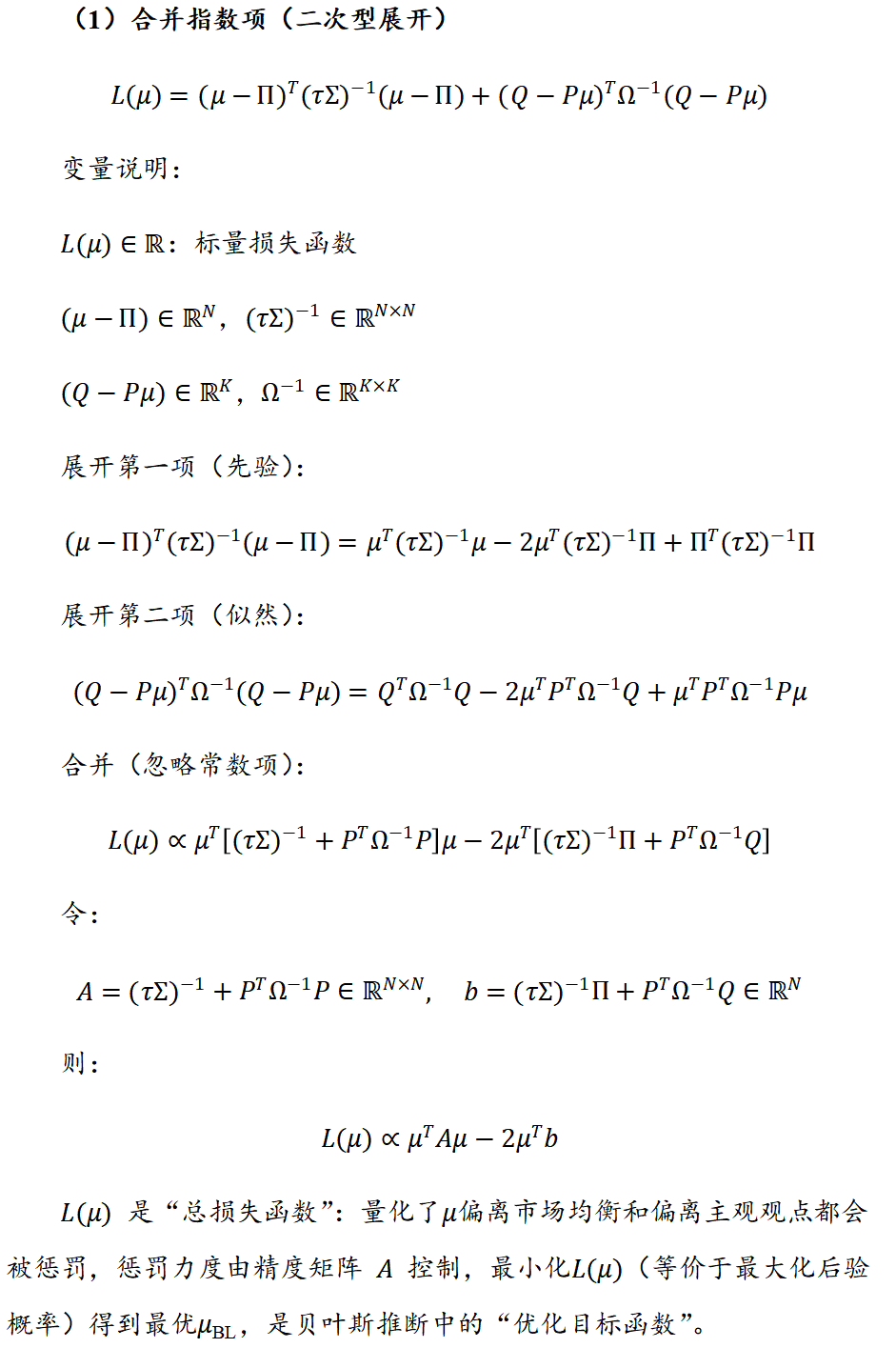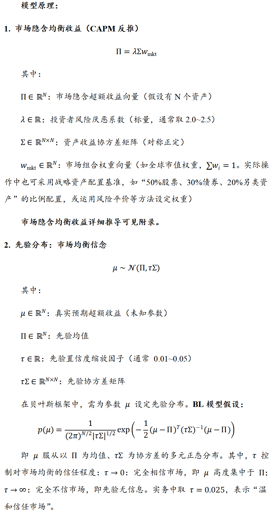 BL模型基于贝叶斯方法,核心是整合两类关键信息以优化预期收益输入:一是市场均衡收益(先验信息),无需投资者直接预测资产绝对收益,而是通过全球市场组合权重反推隐含的市场均衡收益率,作为市场共识的中性基准;二是投资者主观观点(最大似然),提供结构化框架允许投资者以绝对或相对形式表达对资产未来表现的前瞻性判断,并明确观点的信心水平。两类信息经贝叶斯整合后生成综合预期收益向量(后验收益),作为MVO模型输入进行组合优化,最终输出的权重通常更稳定、分散且契合投资直觉。
