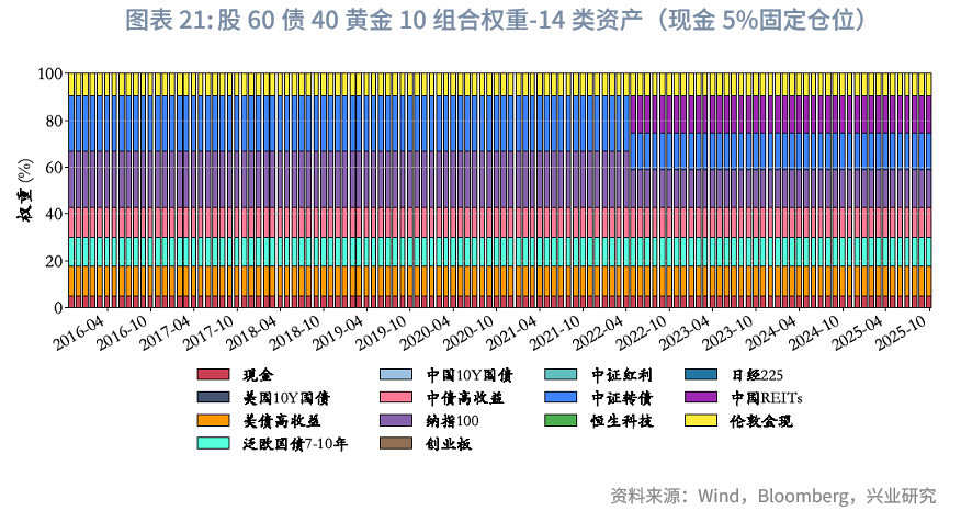 从波动表现最优的前两类组合来看:“风险平价-65%胜率”固收占比86.4%,现金占比5%;“BL-战略基准-自营-65%胜率”的固收类资产占比80%、现金占比5%;“BL-风险平价-65%胜率”与组合的固收类资产占比处于75%-78%区间(接近80%),现金占比同样为5%。其余组合的资产结构中固收类资产占比如下:“永久组合”的固收类资产与现金权重各为25%;“BL-战略基准-资管机构-65%胜率”的固收资产占比50%、现金占比8%;“广义60/40组合”(股票50%、债券40%、黄金10%)的固收类资产占比40%;“等权组合”的固收类资产合计占比约35.7%,同时配置5%现金。可见,上述组合的单年度最大回撤与年化波动率,基本与固收类资产占比呈负向关系,从附录“大类资产年化收益率和波动率”的数据中得到印证,其中现金年化波动率仅0.16%,中美高收益债及中国10年期国债的年化波动率亦控制在5.5%以内。