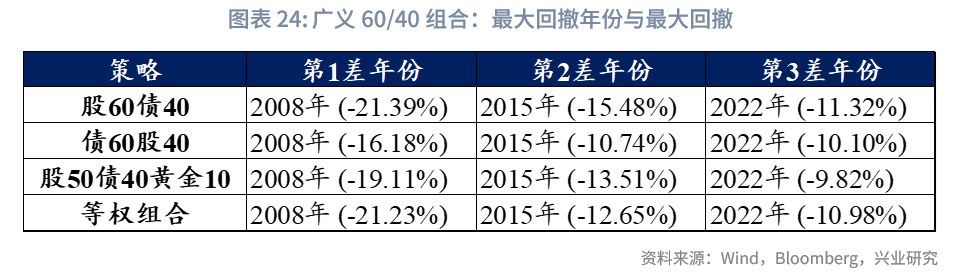 为了考虑流动性,我们设计了三个版本的广义60/40组合模型:(1)股60债40:固定现金仓位5%,95%可配置资产中股票占比60%、债券占比40%;(2)债60股40:固定现金仓位5%,95%可配置资产中债券占比60%、股票占比40%;(3)股50债40黄金10:固定现金仓位5%,95%可配置资产中股票占比50%、债券占比40%、黄金占比10%。