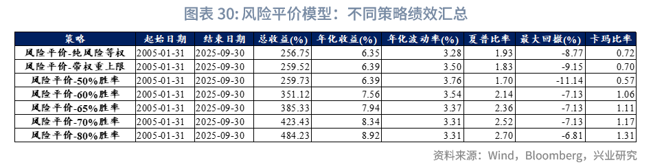 我们设计的风险平价策略分为三个版本:(1)纯粹风险等权(基准版本),95%权重按非现金资产历史波动率倒数分配(确保各资产风险贡献相等),剩余5%固定为现金权重;(2)“风险平价-带权重限制”,在纯粹风险等权版本基础上增设单资产30%权重上限:若资产权重超出上限则固定为30%,剩余权重重新分配以维持风险平价;(3)“风险平价-结合主观观点”,以纯粹风险等权版本为基础,对核心资产按不同胜率施加主观观点调整,并通过相对超额幅度差异化处理波动率(进而影响权重):先通过“资产未来实际收益/历史最大绝对收益”计算相对超额幅度,量化资产收益偏离自身历史水平的程度;再根据主观观点判断准确性(正确/错误)与资产未来收益方向(正/负),差异化生成基础调整因子,若观点正确且资产未来上涨,基础因子按“0.7-相对超额幅度×0.2”计算(相对超额幅度越高,因子越低,波动率降幅越大),若观点正确且资产未来下跌,基础因子则按“1.5+相对超额幅度×0.5”计算(亏损幅度越大,因子越高,波动率增幅越大);同时叠加±0.05或±0.1的随机扰动,避免单一观点的极端影响。最终,通过调整后的波动率间接优化风险平价权重,让“高超额收益且判断正确”的资产获得更高配置,“亏损且判断正确”的资产降低权重。此外,我们设置了50%、60%、65%、70%、80%多个胜率水平。