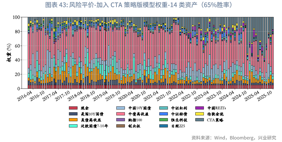 从相关性分析结果来看,CTA策略指数与多数资产呈负相关或低相关关系,其中与该指数相关性最高的资产为中国REITs,相关系数也仅为0.08。从组合表现来看,加入CTA策略后,组合波动显著降低,同时获得更高的夏普比率。与未加入CTA策略的基准组相比,在所有胜率场景下,加入CTA的风险平价模型波动率、最大回撤均有所下降,且夏普比率明显提升,这表明加入CTA策略在未显著牺牲收益的前提下,有效降低了组合波动。