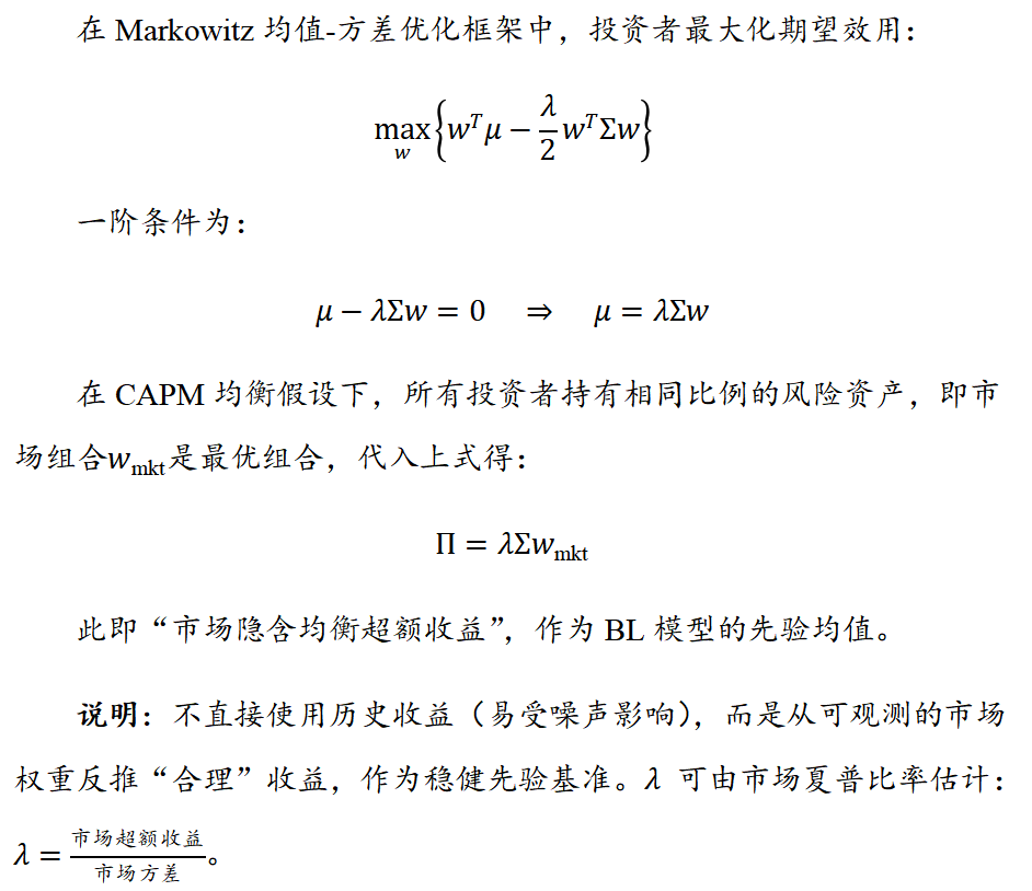 Black-Litterman(BL)模型是一种在资产配置中广泛应用的贝叶斯组合优化模型,由Fischer Black与Robert Litterman于1990年代初在高盛公司任职期间提出,其核心思想在于通过贝叶斯框架将市场均衡隐含收益(作为先验分布)与投资者主观观点(作为似然函数)进行系统性融合,从而生成稳健的后验预期收益估计,以克服传统均值-方差优化模型对输入收益高度敏感所导致的组合极端化与不稳定性问题;该模型不仅尊重市场整体结构所蕴含的信息,还允许投资者以结构化方式(如相对或绝对收益观点及其置信水平)注入主动判断,最终输出兼具市场中性与观点驱动特性的优化资产配置,在全球养老基金、主权财富基金及多资产量化策略中被广泛采用,成为现代投资组合理论从理论走向实践的重要桥梁。