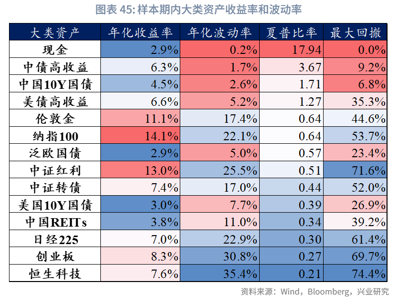 下面两个表展示了筛选后的14个资产子类在样本期内各年度的收益率与波动率情况(样本期内整体年化收益率、年化波动率、夏普比率见附录)。统计分析表明以下几点:(1)现金(货币基金)收益率排名靠前的年份(如2008年、2018年及2022年),通常对应大类资产配置难度较高的市场环境。该类资产表现突出,往往意味着其他大部分资产难以提供正收益,甚至多数出现负收益,从而突显其避险属性;(2)在上述市场环境复杂的年份中,中国10年期国债与中债高收益债券普遍表现优异,基本位列当年收益率前两位。