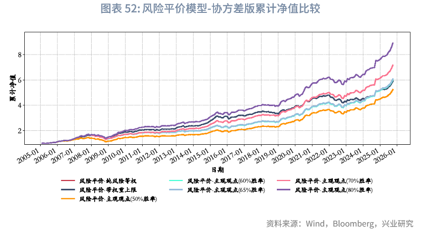 我们对“BL-风险平价”的多个版本展开对比,具体包括基准(各类资产等权重)、无观点版(风险平价权重)与生成主观观点版;其中主观观点的胜率水平仍设置为50%、60%、65%、70%,且观点生成方法与“BL-战略基准”完全一致,此处不再赘述。