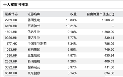 该指数追踪港股上市的30家最大型可供港股通交易的生物科技、药品及医疗设备公司。其十大权重股包括药明生物、百济神州、信达生物、康方生物、中国生物制药、石药集团、三生制药、药明康德、汉森制药、京东健康,均为行业内的领军企业。