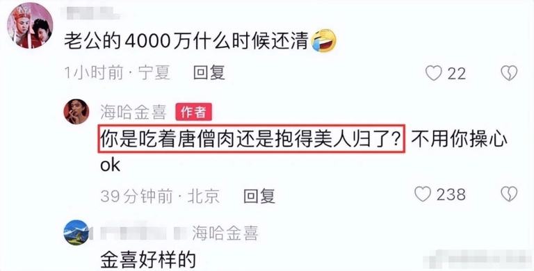2023年5月,海哈金喜晒出母子合照。随后,有网友在其评论区留言“老公的4000万什么时候还清”?海哈金喜评论回怼道“你是吃着唐僧肉还是抱得美人归了?不用你瞎操心OK”。