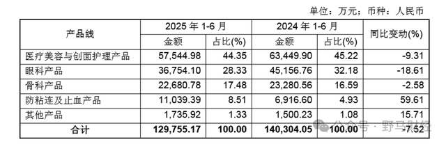 眼科业务收入3.68亿同比下降18.61%,营收占比从32.18%降至28.33%,成为下滑最严重的板块。防粘连及止血产品收入1.1亿同比增长59.61%,但占比仅8.51%难以扭转局势。