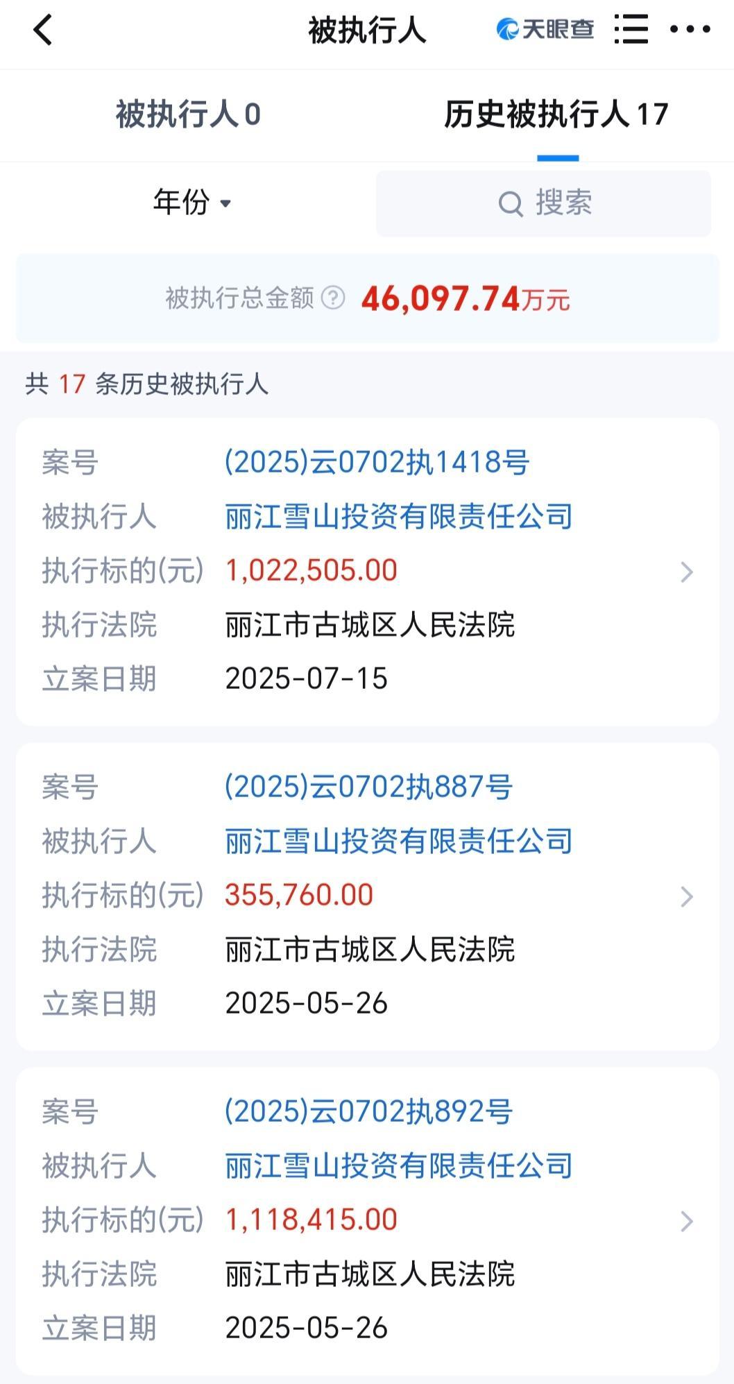 2025年7月,丽江雪山投资有限责任公司被丽江市古城区人民法院下达限制消费令。7月17日,该公司新增一则被执行人信息,执行标的102.25万元。5月27日,其单日新增3条被执行人记录,总金额达244万元。天眼查显示,该公司累计被执行总金额超过4.6亿元。