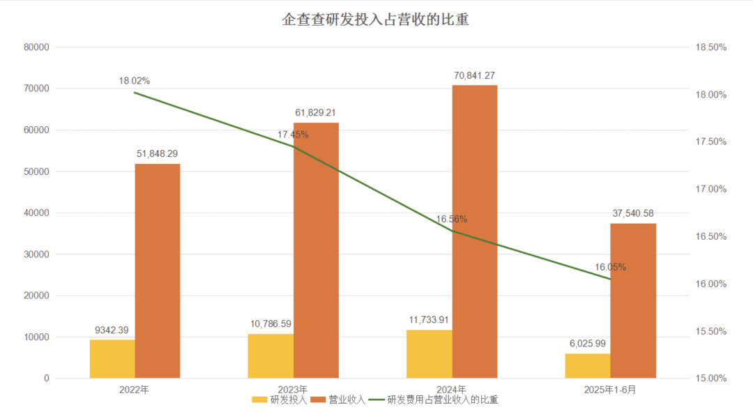 然而,企查查过往在研发投入方面比较克制。2022年至2024年,公司研发费用呈上涨趋势,但并未赶上营收增长速度。研发投入占营业收入的比例从18.02%一路下滑至16.05%。
