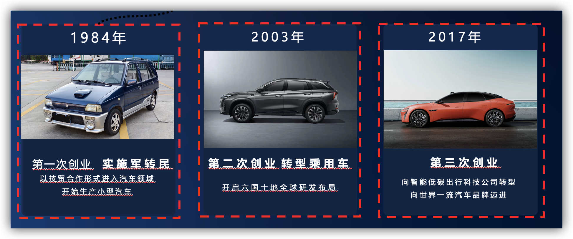 上世纪80年代,长安启动“军转民”,主动蹚入市场经济大河,解决生存问题,甚至自己拆解样车,达成与日本铃木合作微型车;2003年,紧跟私家车普及大潮,启动二次“创业”,从商用车转向乘用车;