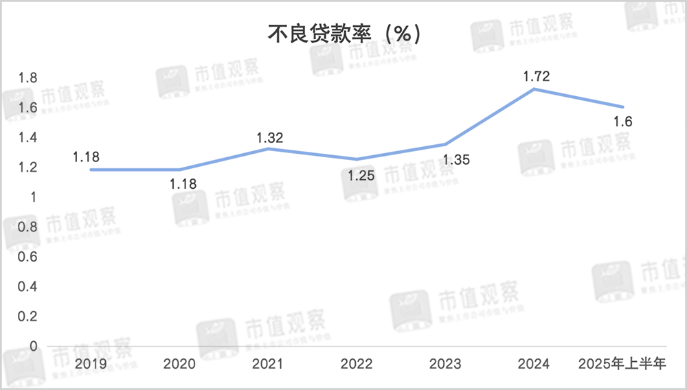 近年来,该行不良贷款率总体呈上升趋势,2019年至2025年上半年由1.18%增长至1.6%,位居17家A股上市城商行第4位。