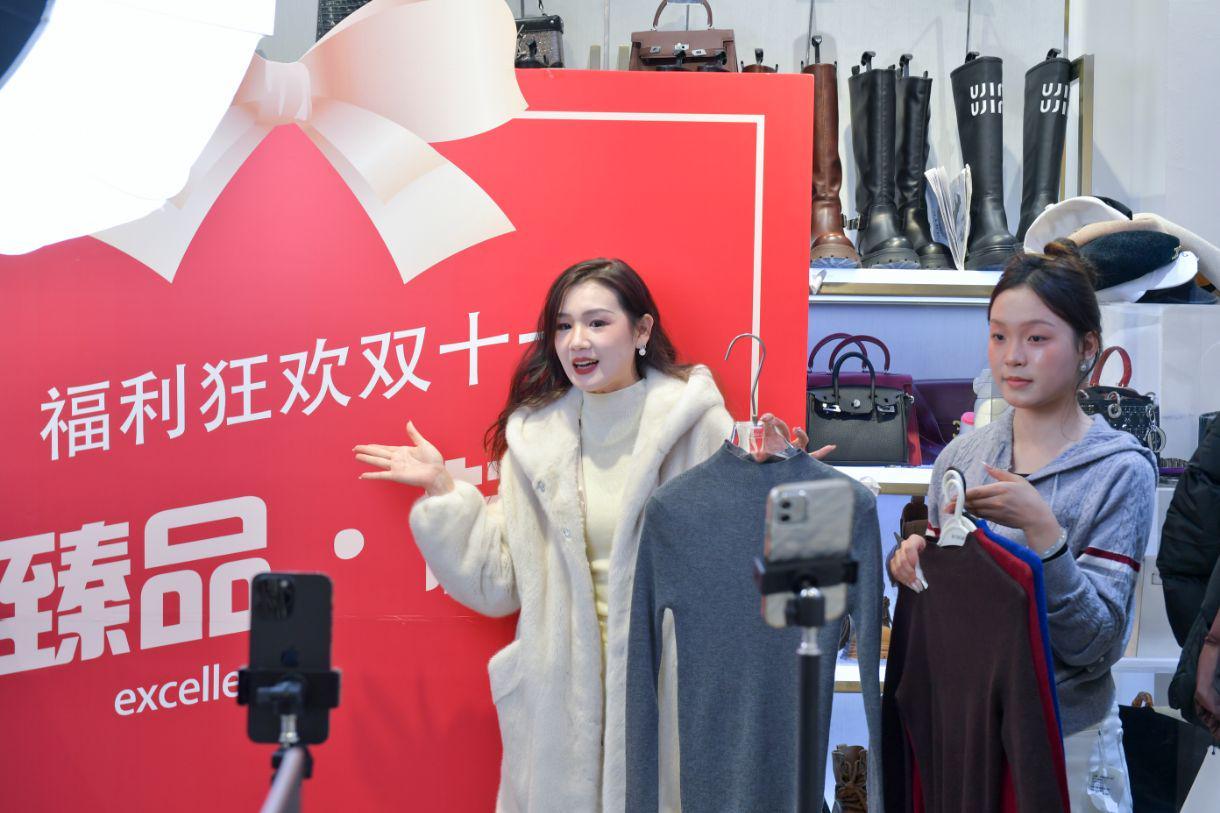 目前,“双11”大促刚刚开场,竞争已异常激烈。图为在山东临沂华丰国际服装城,主播正在介绍商品。(图片由CNSPHOTO提供)