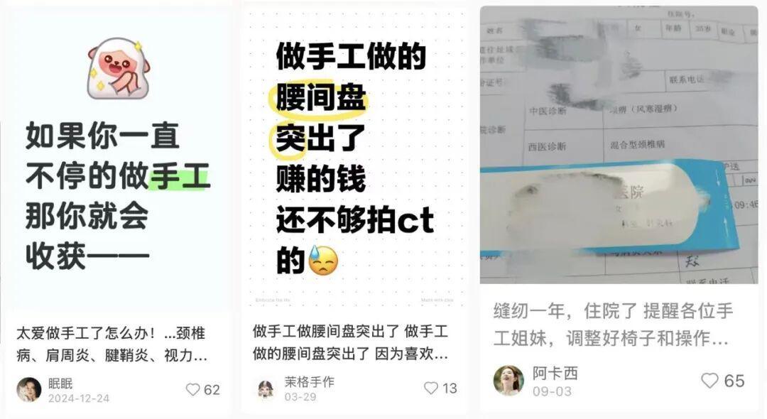▲ 社交媒体上,许多手工爱好者表示长期做手工容易引发一些健康问题。图 / 小红书截图