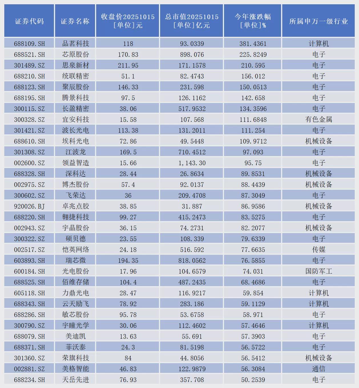 A股市场对智能眼镜赛道的关注度持续升温。同花顺数据显示,目前AI眼镜概念板块共有161家上市公司。截至10月15日收盘,今年以来115家公司股价上涨,其中32家涨幅超50%,品茗科技、芯原股份、思泉新材等10家公司股价实现翻倍。