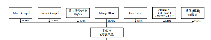 招股书显示,米连科技的股东结构较为多元。Mee Group持股29.83%,Rose Group持股24.81%,任喆先生、朱晓朴先生及MeePartners等订立了一致行动协议。此外,Marry Bliss(蓝驰星合)持股10.71%,员工持股计划平台持股8.5%,小米集团通过Fast Pace持股8.3%。其中,蓝驰是最大外部投资者,小米为第二大外部投资者。