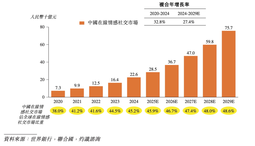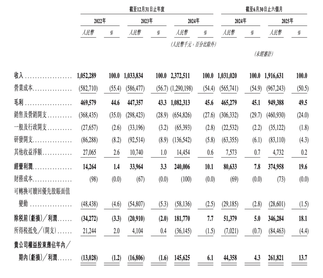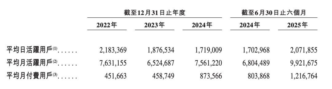 截至2025年6月30日止六个月,米连科技的平均月活跃用户达990万名,平均日活跃用户达210万名,平均月付费用户达120万名,付费用户转化率为12.3%。财务层面,米连科技更是从2024年以来实现大幅增长。2022年至2024年,米连科技分别实现营业收入10.52亿元、10.34亿元、23.73亿元,毛利率分别为44.6%、43.3%、45.6%,净利润分别为-1300万元、-1680万元、1.46亿元,实现扭亏为盈。2025年上半年,米连科技营业收入19.2亿元,同比增长85.8%,实现净利润2.62亿元,同比增长490%。根据灼识咨询的资料,以收入计,截至2025年6月30日,伊对位列中国在线情感社交市场第一。
