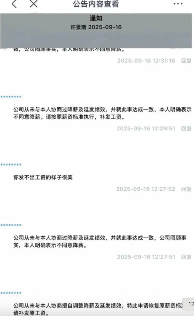 有受访员工表示,9月11日(发薪日前四天)公司确实召开会议讨论降薪事宜,并提及降薪幅度。但当时并未征求员工同意,会议也未全员参加。会后既未发布正式文件公告,也未进行一对一沟通。直到月中发完工资后,董事长才发布落款为9月16日的通知。