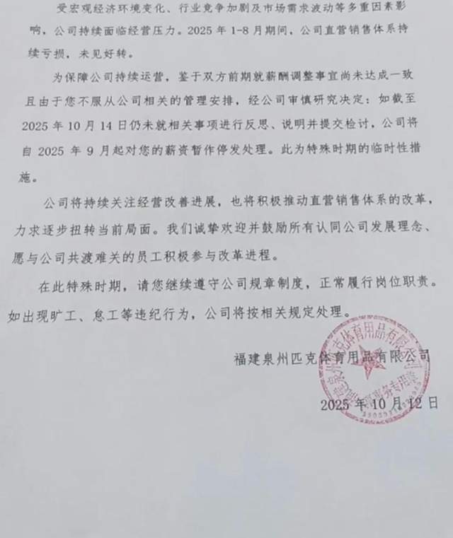 近日,匹克公司降薪事件持续发酵,最新消息显示,部分拒绝降薪的员工收到公司“警示”:若不提交反思检讨,将面临停发工资的处罚。这场风波是否会进一步升级,成为行业关注的焦点。