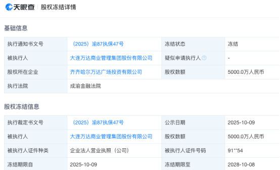 此次股权冻结涉及的企业分别为广州万达广场投资有限公司和齐齐哈尔万达广场投资有限公司,冻结股权数额分别为1亿元和5000万元,合计高达1.5亿元。冻结期限自2025年10月9日起至2028年10月8日止,执行法院均为成渝金融法院。