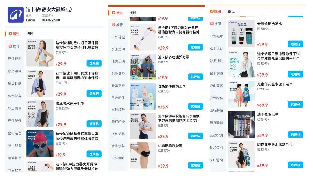 9月20日,迪卡侬全国208家门店接入淘宝闪购,实现“线上线下同价,分钟级送达”。截至7月,其月成交额突破1000万元,水上运动品类暴增700%,健身品类增长超50%。这种专业化、场景化的消费渗透,印证了淘宝闪购对品牌全域生意的支撑作用。数据显示,7月单月有395个非餐品牌月成交破百万,美的、追觅等260家品牌旗舰店全面接入,标志着即时零售从“应急渠道”升级为“核心增长引擎”。