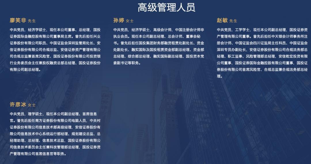 然而时间过去近一年,国投证券高管团队仍然只有4人。除了总经理廖笑非外,还包括副总经理、总会计师、董事会秘书孙婷;副总经理、首席风险官、合规总监赵敏;副总经理、首席信息官兼信息技术委员会主任许彦冰。