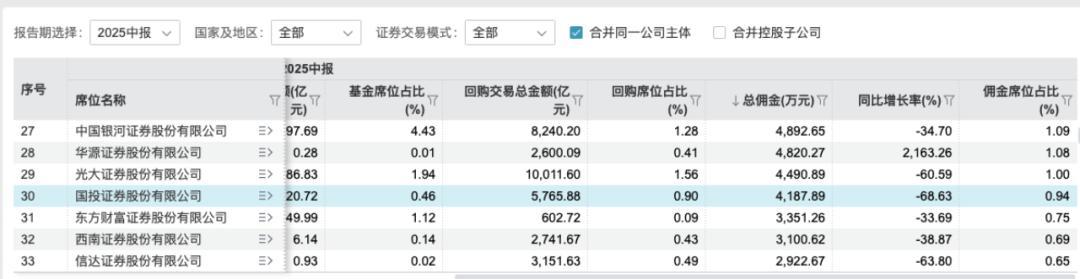 而到了2024年,国投证券分仓佣金收入仅1.96亿元,同比下降43.74%,行业排名第23位;2025年上半年分仓佣金收入0.42亿元,同比下滑68.63%,行业排名第30位。