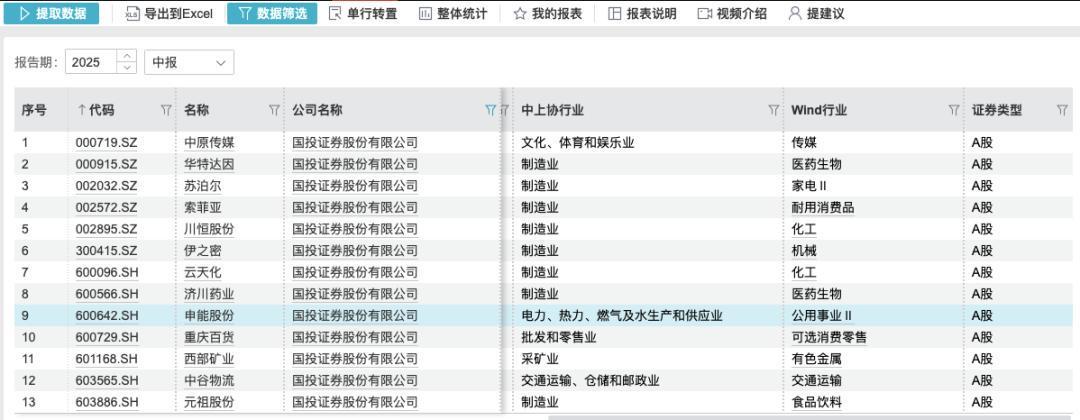 Wind数据显示,截至2025年二季度末。国投证券重仓了13只股票,其中8只属于制造业,包括华特达因(000915.SZ)、苏泊尔(002032.SZ)、索菲亚(002572.SZ)、川恒股份(002895.SZ)、伊之密(300415.SZ)、云天化(600096.SH)、济川药业(600566.SH)、元祖股份(603886.SH)。