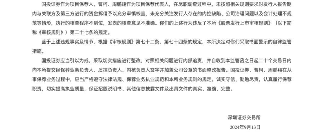 此前,2024年9月13日,国投证券还因在苏州奥德高端装备股份有限公司创业板IPO保荐项目中存在三项违规,国投证券及保荐代表人曹柯、周鹏翔被深交所下发监管函。