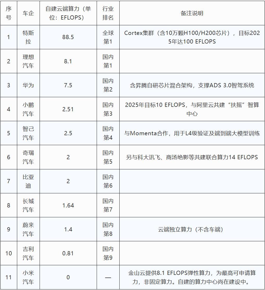 云算力数据揭示残酷现实:特斯拉以100 EFLOPS领跑,理想(8.1EFLOPS)、小鹏(10EFLOPS)、小米(11.4EFLOPS)形成第二梯队,哪吒等品牌算力不足前者的1/10。元戎启行CEO周光指出,需10万辆级量产车才能支撑VLA架构,中小车企面临双重困境:
