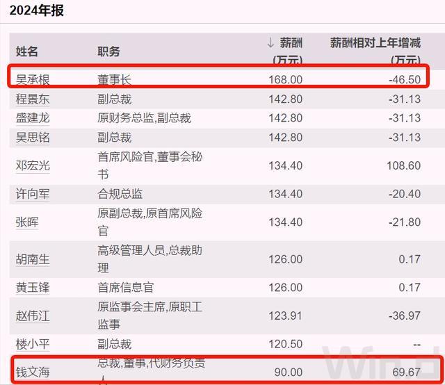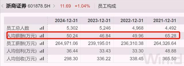 根据公司年报,2024年,吴承根的税前薪酬为168万元,较之前减少了46.5万元,但依旧排在第一位;而钱文海的薪酬为90万元,在高管中相对靠后。至2024年末,浙商证券职工总数超过5300人,去年人均创利36.4万元,人均税前薪酬超过50万元,比2023年增加大约3.4万元,但和2021年超过65万元相比,减少大约15万元。金融国企央企尤其是券商响应号召,最近几年下调薪酬还是很明显的。钱文海去年薪酬90万元,也就比公司人均薪酬多大约40万元,差距并不大。