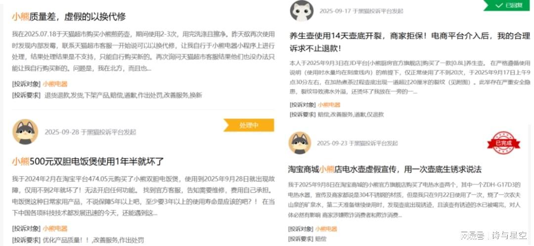 消费者对小熊电器的质疑不仅限于壶类产品。关于电饭煲、煮蛋器、豆浆机等其他品类的“精准年抛”现象也屡见不鲜。许多消费者反映,这些产品使用不到一年便出现故障,而使用过程中存在的安全隐患更是令人担忧。