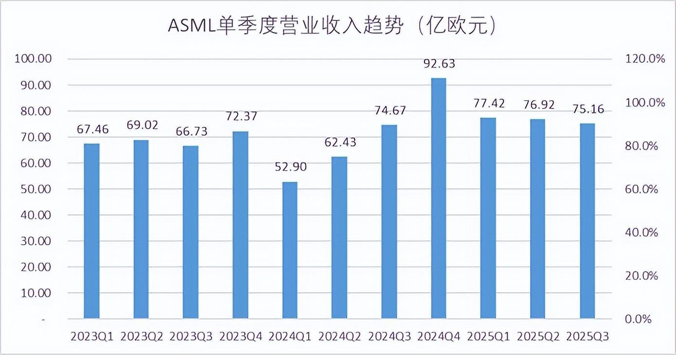 北京时间10月15日,全球光刻机龙头ASML(阿斯麦)发布2025年第三季度财报,核心数据引发行业关注。报告显示,当季营收75.16亿欧元,略低于市场预期的76.8亿欧元,但每股收益5.49欧元超出预期的5.33欧元,主要得益于费用控制优于指引区间。