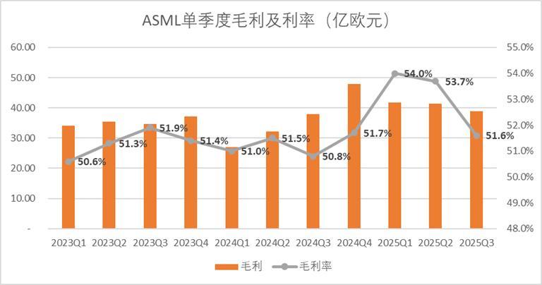 图:ASML单季度毛利及毛利率趋势(来源:企业财报,锦缎研究院整理)