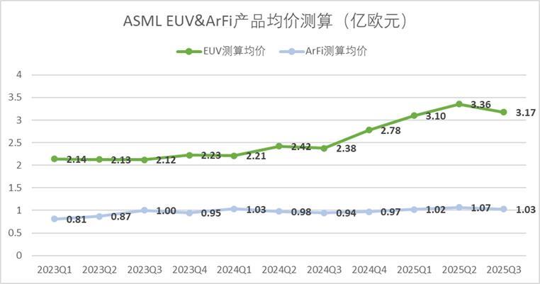 价格方面,EUV单台均价(含服务)约3.17亿欧元,环比下降5.4%;ArFi单台均价下降3.4%。两者均价在连续三个季度增长后首次回落,但仍处于高位。