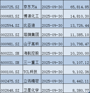 在增持数量方面,京东方A同样表现抢眼,三季度被北向资金增持了6.58亿股,成为增持最多的股票。博源化工(000683)、比亚迪(002594)、塔牌集团(002233)、山子高科(000981)、海航控股(600221)等股票也获得了北向资金的大幅增持,增持数量均超过1亿股。