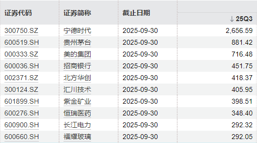 招商银行(600036)、北方华创(002371)、汇川技术(300124)的持股市值超过400亿元,紫金矿业(601899)、恒瑞医药(600276)的持股市值超过300亿元,长江电力(600900)、福耀玻璃(600660)的持股市值超过200亿元。