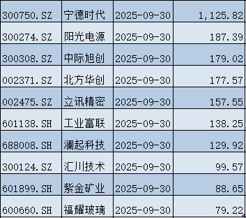 从持股市值来看,宁德时代(300750)以2656.59亿元的市值高居榜首,成为北向资金三季度持仓市值最大的股票。贵州茅台(600519)、美的集团(000333)的持股市值也超过700亿元,分别达到881.42亿元、716.48亿元。